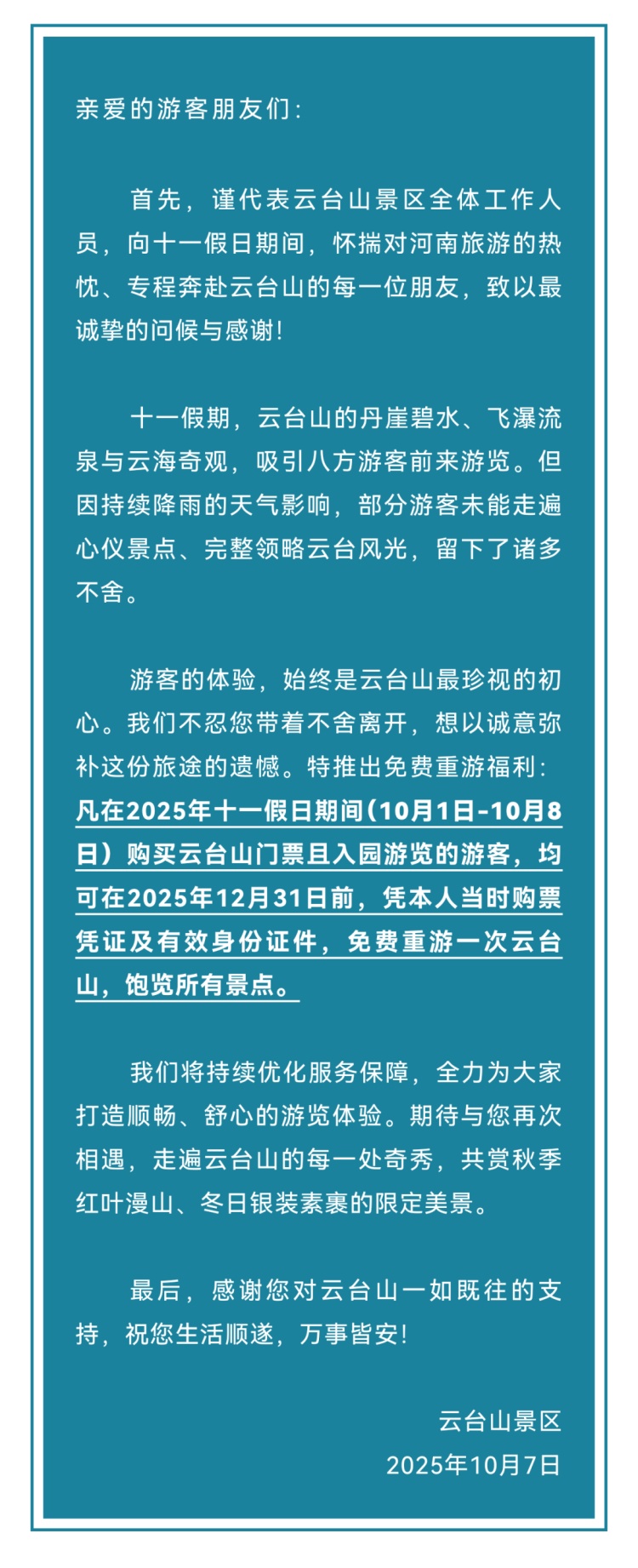 10月7日上午,云台山景区官方微信发布消息,凡在2025年国庆假日期间(10月1日 - 10月8日)购买云台山门票且入园游览的游客,均可在2025年12月31日前,凭本人当时购票凭证及有效身份证件,免费重游一次云台山,尽情饱览景区所有景点。