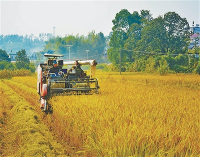 10月12日,在安徽省安庆市岳西县温泉镇,农机手驾驶收割机收割水稻。